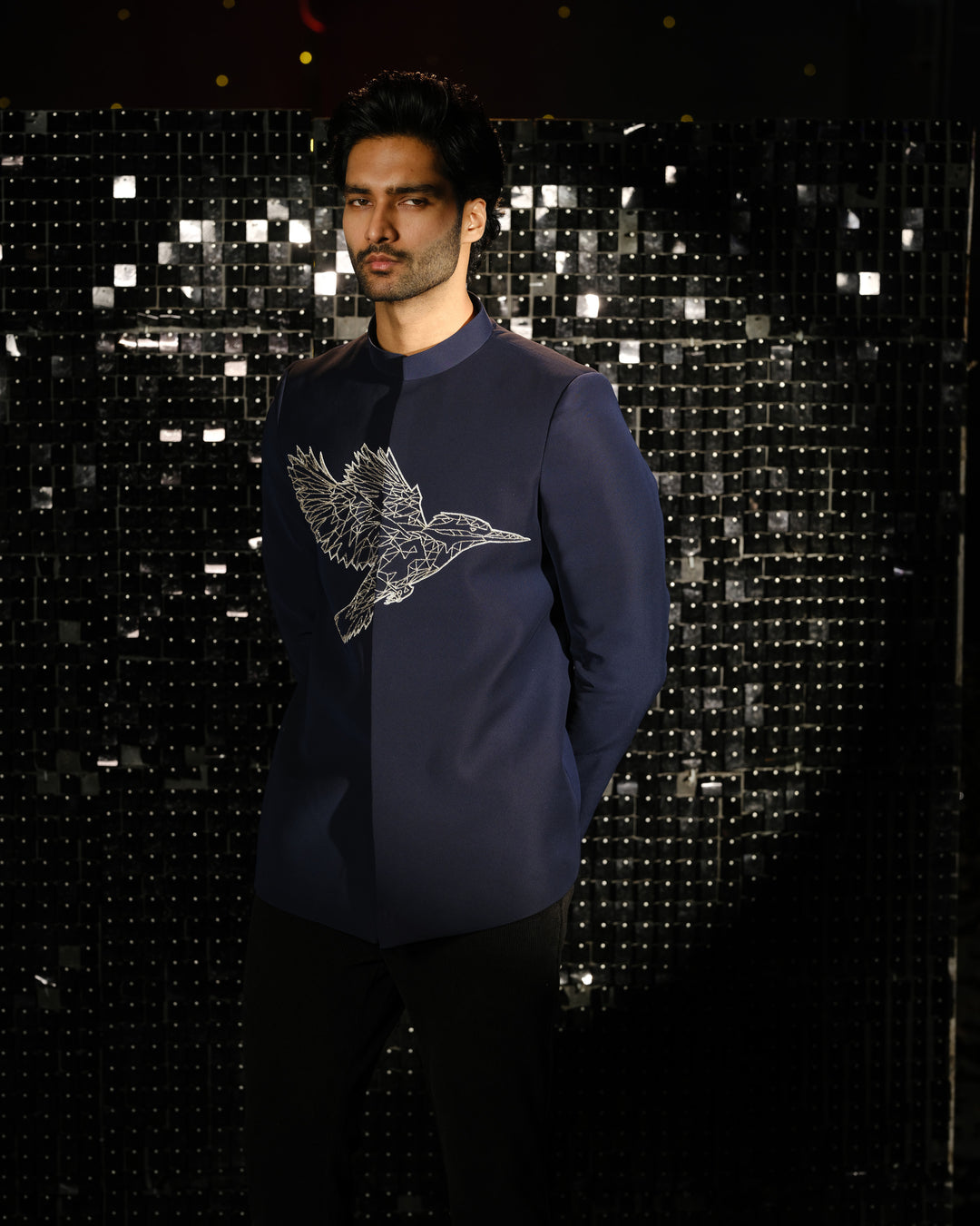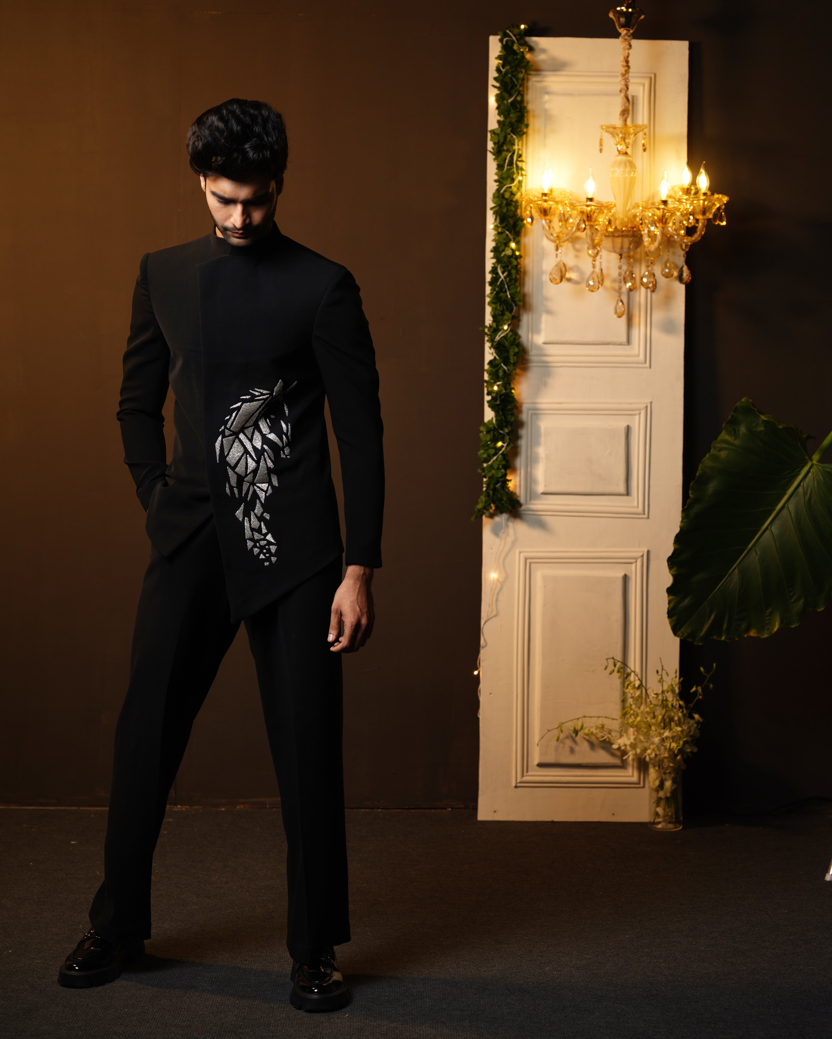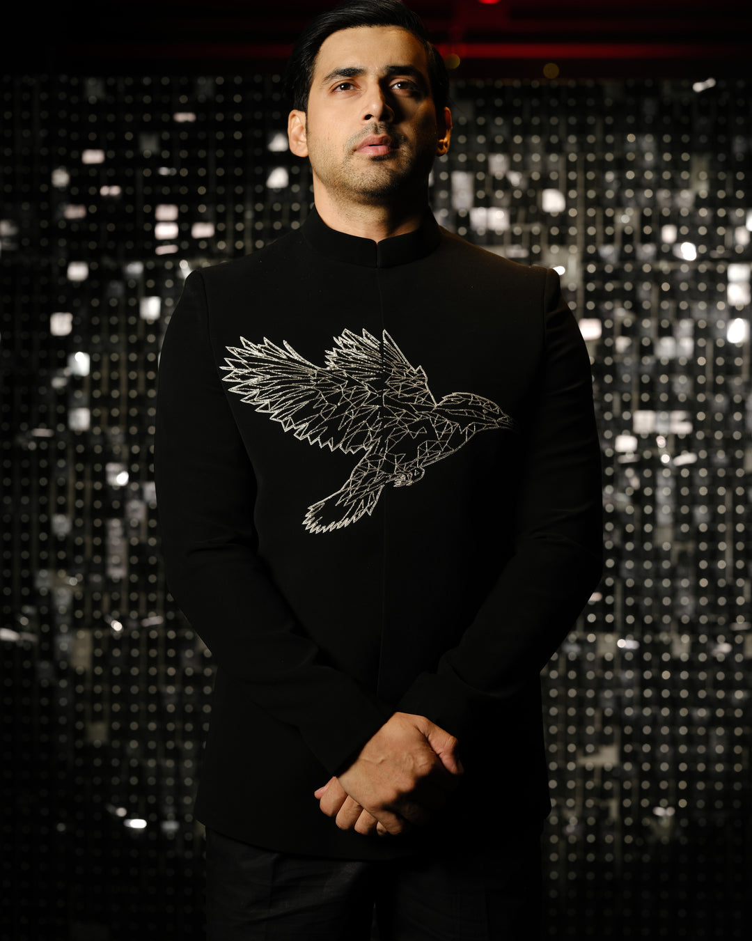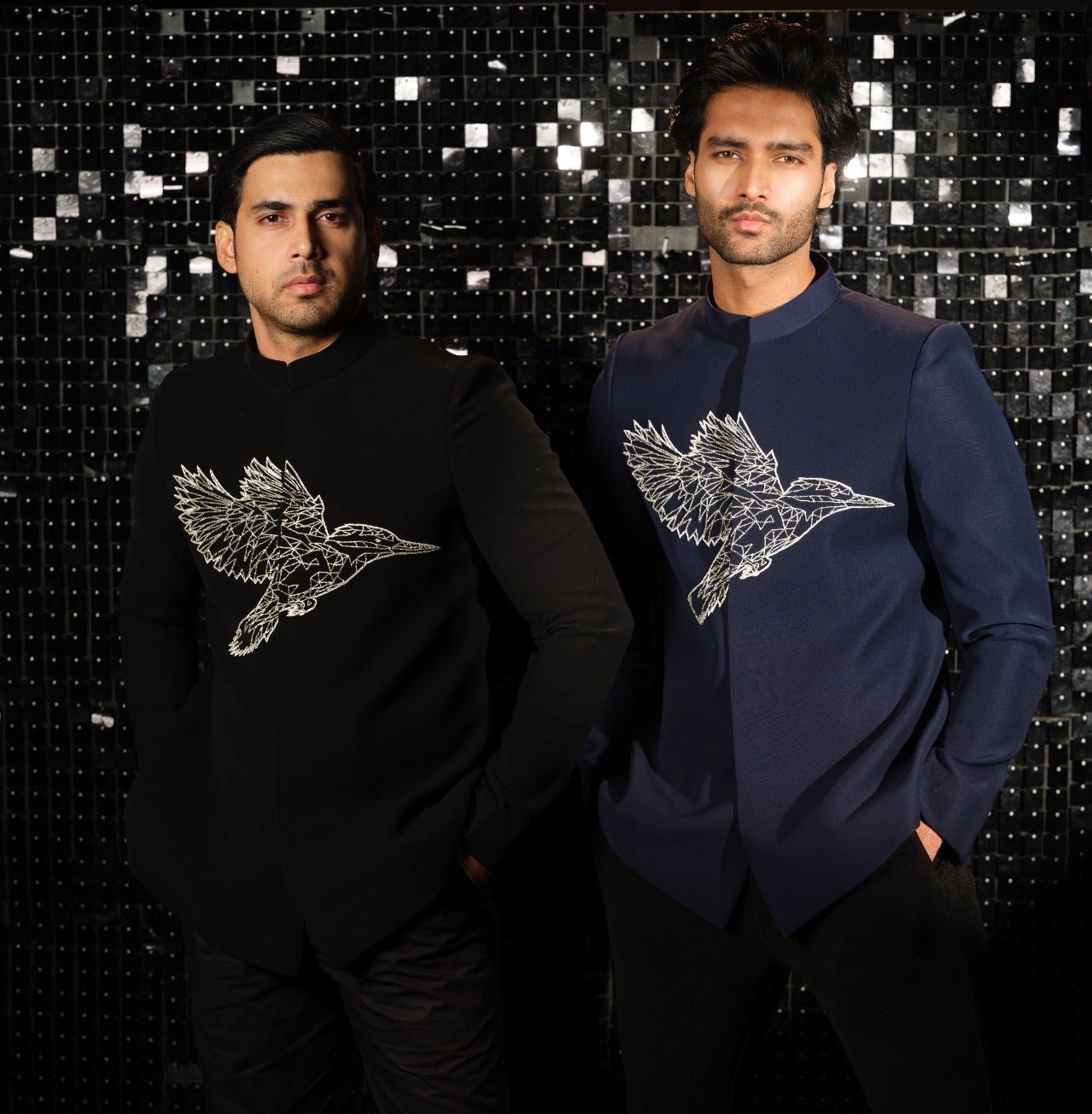 Our design house creates refined cocktail menswear, specializing in black, white, and midnight blue shirts, Bandhgala’s, and tuxedos. They are known for intricate hand embroidery using cutdana, poth, sequence, in silver, gold, black, and gunmetal, perfect for seminar-ready elegance.