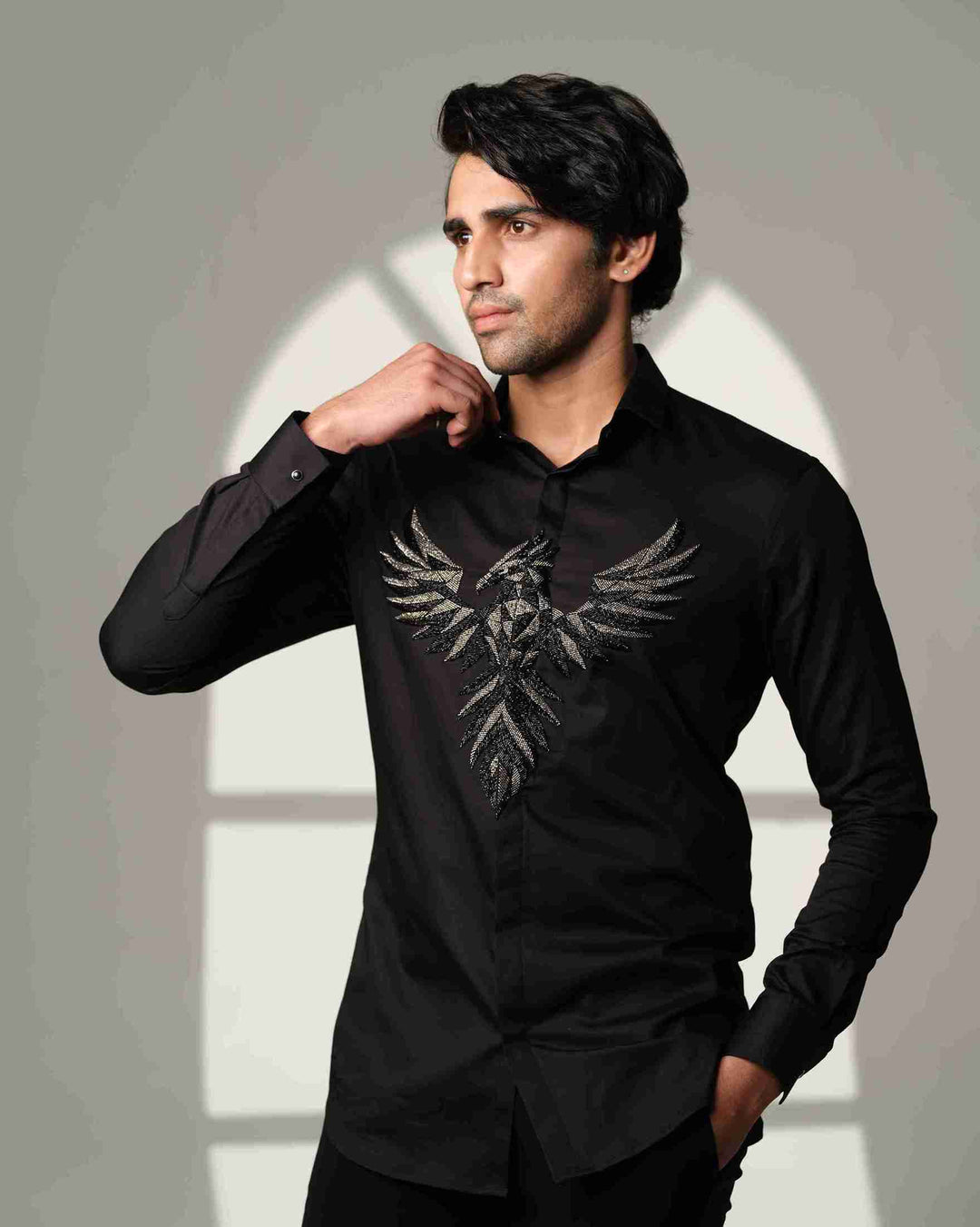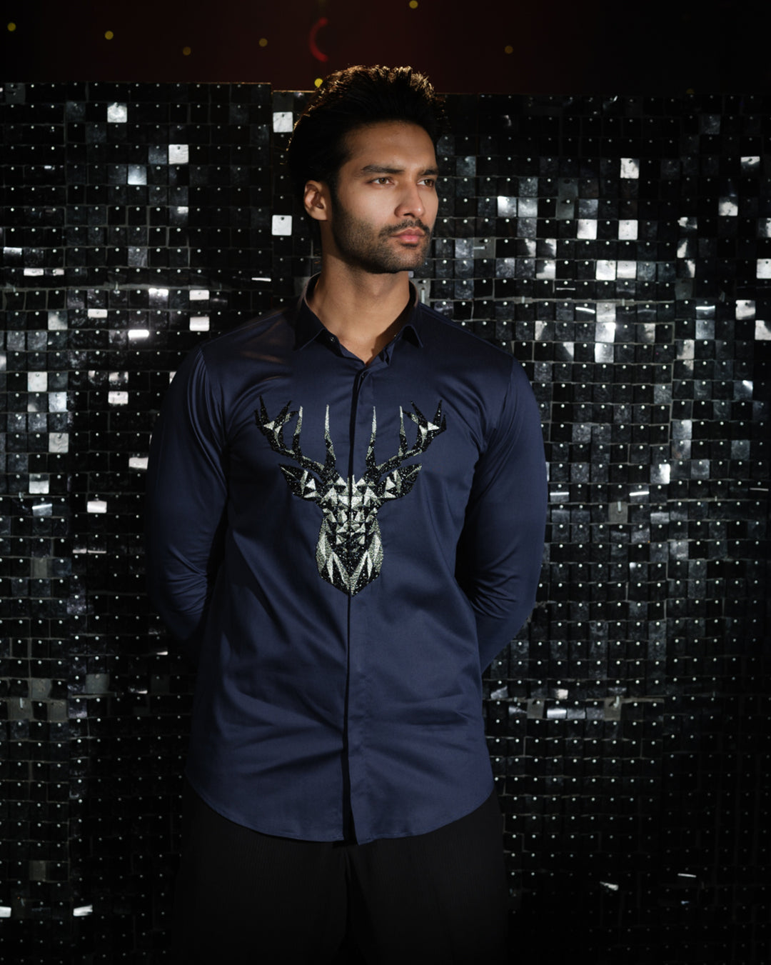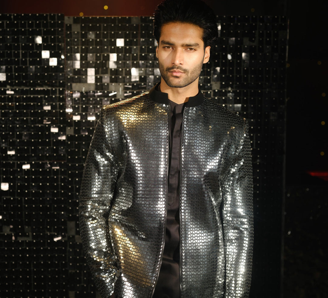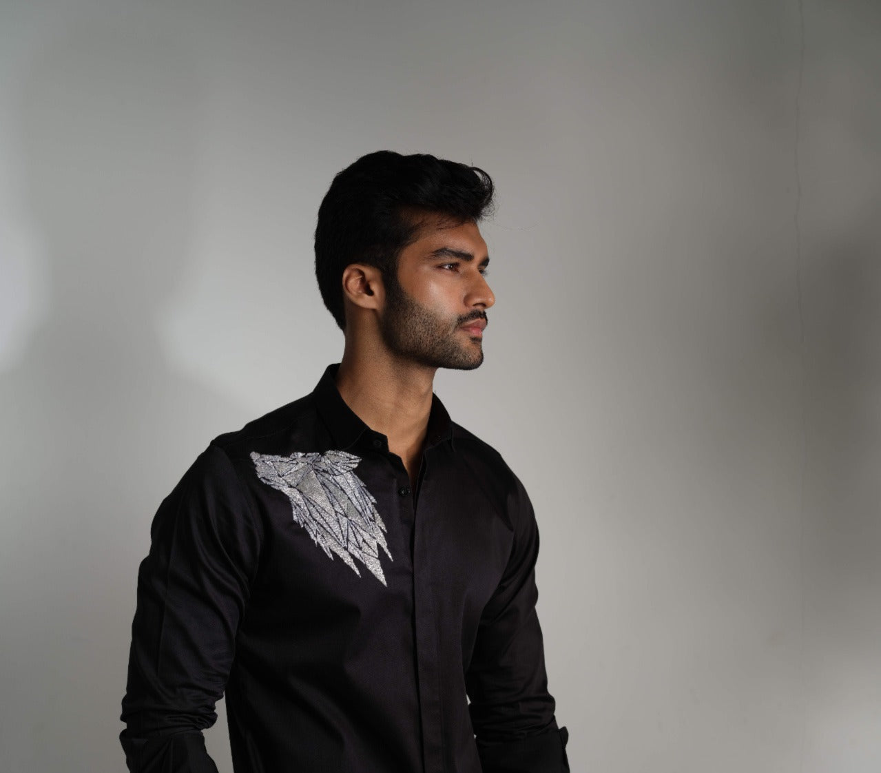 Our design house creates refined cocktail menswear, specializing in black, white, and midnight blue shirts, Bandhgala’s, and tuxedos. They are known for intricate hand embroidery using cutdana, poth, sequence, in silver, gold, black, and gunmetal, perfect for seminar-ready elegance.