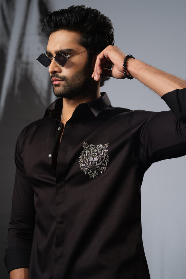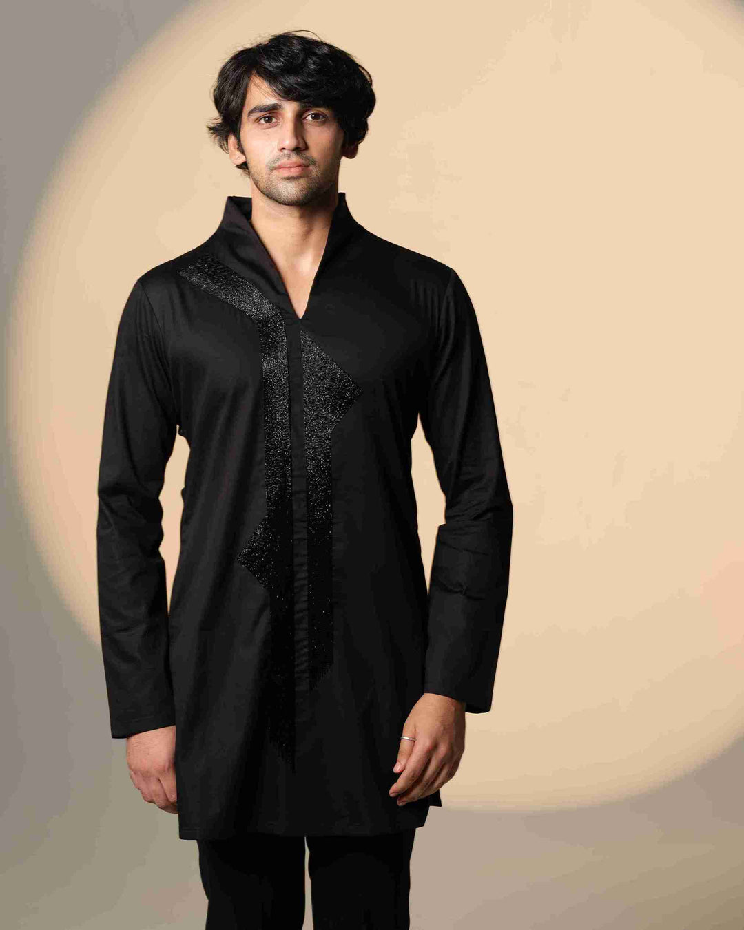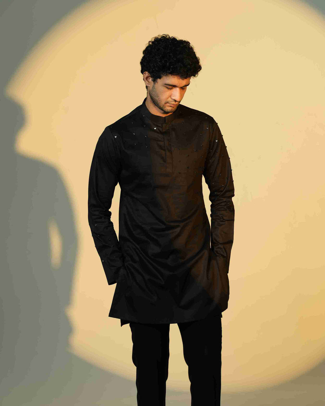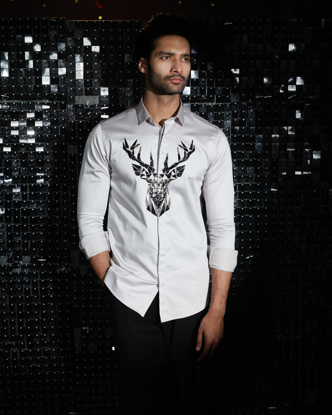 Our design house creates refined cocktail menswear, specializing in black, white, and midnight blue shirts, Bandhgala’s, and tuxedos. They are known for intricate hand embroidery using cutdana, poth, sequence, in silver, gold, black, and gunmetal, perfect for seminar-ready elegance.
